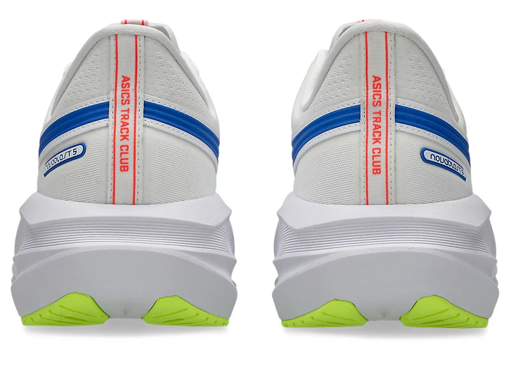The NOVABLAST™ 5 ASICS TRACK CLUB running shoe's midsole and outsole geometry helps produce an energized ride. Its colourway is inspired by 1980s track suits and running shoes.